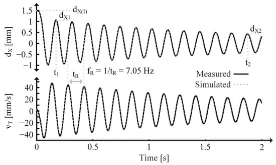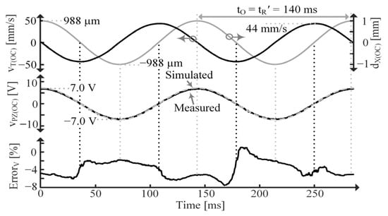 Figure 18 shows simulated and measured data for the OC PT. Note the difference in period, and , between the SC and OC cases, respectively, which results from ’s inclusion when OC, as discussed in Section 2.3 [9]. is the period of an vibration. Also note that is in phase with while is in phase with [1,4,7,9,16,17,18,19,20]. is smaller than because is used for curve fitting, so any parameter errors will be more apparent in the plots.