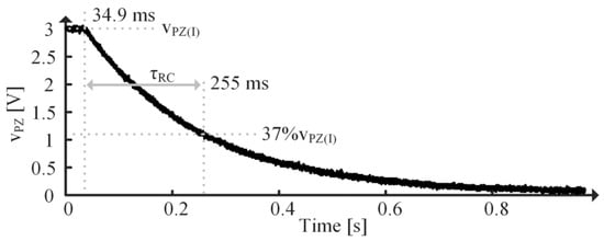 The MIDE S129 PT only weighs about 1.4 g, so with a 36 g tip mass, (33) holds true. So, is 36 mF (“milli” is used because the SI unit of mass is kg). of the PT tip is measured using the Keyence sensor shown in Figure 15. While shorted, the PT is bent to an initial displacement, released, and allowed to vibrate freely. Figure 11 shows the measured and , for the PT which is used to extract and .