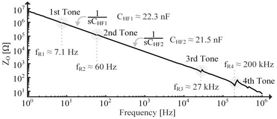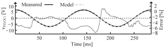 If working with a step function input, the higher tones supply energy to the ED, so it is ideal to account for their full models. While can be measured, is unknown, so cannot be determined. and can also be measured, but can be difficult to measure since a high-speed, high-sensitivity displacement sensor is required. So, to approximate , , , , and , parameter estimation/curve fitting can be used [32,33]. has a similar limiting condition as before, but this time, the first tone capacitance is accounted for, and more is unknown: