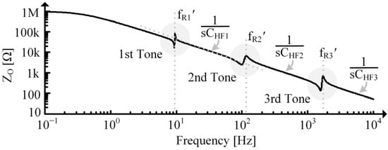 ’s response across frequency is shown in Figure 6, but note that each attribute of the response is variable. and will be more separated at large s and come closer together as reduces. As gets larger relative to and , it will dominate the response, and the prominence (i.e., quality factors) of and spacing (i.e., , shown in (11)) between the and peaks will reduce. When and get too close together, ’s peaks may no longer correspond to and .