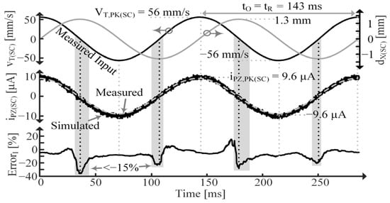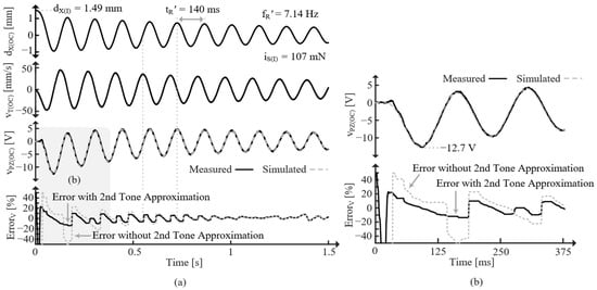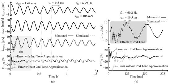 Figure 20 shows the response for the SC PT released from an initial displacement, , which corresponds to an initial force, . Note that can be determined with (35) because all the current (force) goes through . Since the PT is SC, it oscillates at . The effects of the second tone can also be seen, especially in Figure 20b, and its frequency, , can be measured. The errors with and without the second tone approximation are shown. After the second tone’s effects subside, the errors are the same and always less than 10%. However, including the second tone greatly reduces error while its effect is present, indicating the model’s ability to accurately account for higher tones.