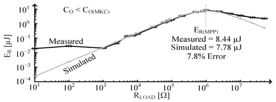 In Figure 19, resistors are applied across the PT to test the model’s ability to predict accurate responses under various loading conditions. Energy burned by a load resistor, , is measured across a one-second time interval when the PT experiences the same as in Figure 17. Figure 19 estimates the maximum power point (MPP) resistance to be about the same as what was measured and shows approximately a 9% error between the MPP energies, . Deviations between simulated and measured data at very low are attributed to the noise floor limits of the oscilloscope. Similarly, deviation at high is most likely due to the limitation of the ammeter.