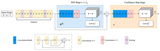 A popular solution for human pose estimation is the Openpose framework [35]. Openpose is a well-known open-source library using convolutional neural networks (CNN) to achieve powerful human pose estimation. Notably, the Openpose framework is not only outstanding in estimating human poses, but it also excels at tracking facial expressions, torso, limbs, and subtle finger movements in both single- and multi-person scenarios. The network structure of Openpose is illustrated in Figure 1.