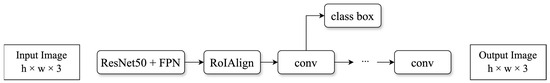 Another noteworthy approach is DensePose-RCNN [36], integrated within the Detectron2 framework [37]. The DensePose-RCNN leverages three prominent deep learning models: Denspose, Mask-RCNN [38], and DenseReg [39]. The model is highly proficient in predicting dense correspondences of body parts and executing intricate pose estimations of individuals. Specifically, the model is capable of assigning each pixel to a specific part of the human body, such as the head, hands, feet, etc., and providing comprehensive posture information for these parts, including factors such as the rotation angle and position. This detailed, dense correspondence underscores the substantial application value of DensePose-RCNN. Beyond providing fundamental pose information, it aids in understanding the nuanced movements of various parts of the human body, thereby offering a wealth of potential applications in human behavior analysis and virtual try-on solutions, among others. Figure 2 depicts the network structure.