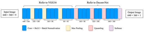 As shown in Figure 3, TrackNet adopts the Convolutional Neural Network (CNN) architecture that considers a sequence of consecutive video frames to generate a probability map of the shuttlecock’s position for each frame. This approach is aimed at learning not merely the visual features of the ball but also the distinct characteristics of its trajectory patterns in order to achieve precise positioning. The ultimate objective of this methodology is to calculate the ball’s flight path and accurately locate the shuttlecock in blurred images. The first 13 layers of TrackNet are the same backbone of the VGG16 model, and these are utilized for feature extraction. The subsequent layers, numbered 14 to 24, are inspired by DeconvNet and aim to generate predictions at the pixel level.