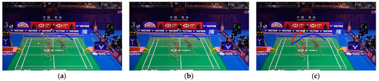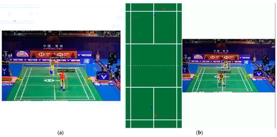 Identifying the stances of badminton players is crucial for distinguishing their offensive intentions and positioning within the match. In this study, we used the DensePose model, as discussed in Section 2.2, to estimate players’ postures (see Figure 6a). Although OpenPose offers superior accuracy in human pose estimation, its computational intensity when detecting multiple individuals concurrently led us to consider DensePose as a more practical alternative.
