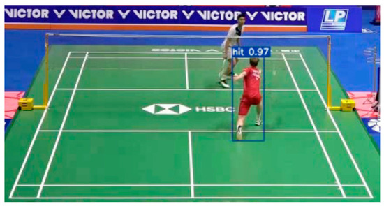 To train the action-detection model, we collected a set of videos and labeled each player’s hit action manually. These videos feature multiple players performing strokes against various backgrounds, taken from official competition videos. The model used in this study was YOLOv7, as described in Section 2.3. A threshold is applied to the prediction outputs of the model, where a high confidence score in a specific frame implies that a player is performing a hit (see Figure 8). Notably, both the shuttlecock-tracking and action-detection modules are susceptible to false alarms or detection misses. The objective of the proposed SRA is to combine the results of both modules, thereby providing the precise identification of the hit moment.