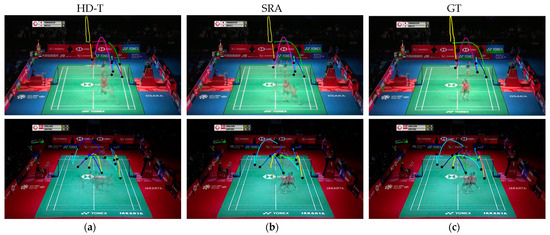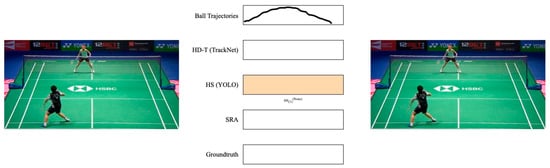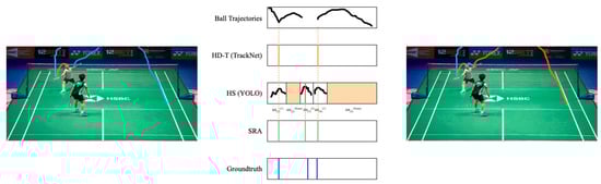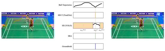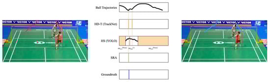 Figure 15 allows us to clearly see that SRA can successfully eliminate false positives generated by HD-T. As shown in the first row of Figure 15, HD-T produced a false positive due to an error in detecting the shuttlecock’s trajectory (indicated by the red segment). By using SRA, we can confirm that no other player was performing a hitting action during that time, thereby successfully eliminating that false positive.