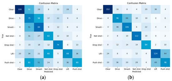 Comparison of shot-type classification results when IoU threshold is set to 0.5. A darker color represents a higher value. (a) TrackNet; (b) SRA.