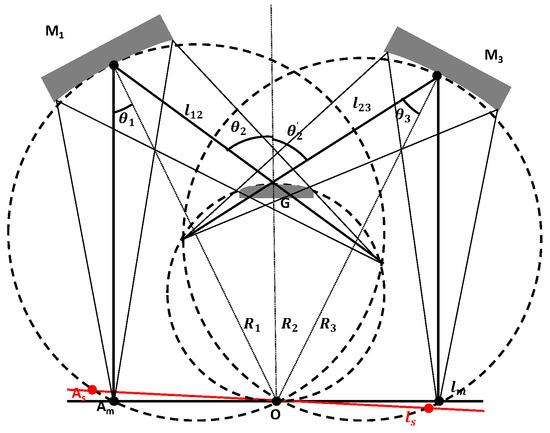 In this figure, M1 represents the first mirror of the Offner system, with a curvature radius of . G represents the grating inside the Offner system, with a curvature radius of . M3 represents the third mirror of the Offner system, with a curvature radius of . denotes the angle of incidence of the chief ray relative to the nth surface. is the optical path of the incidence point between M1 and G, and is the optical path between G and M3. and are the imaging distances in the meridional and sagittal planes, respectively.