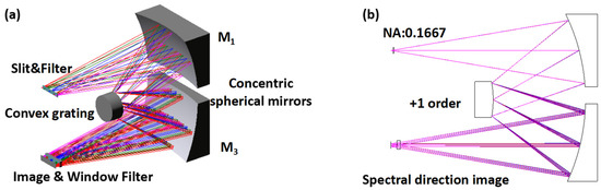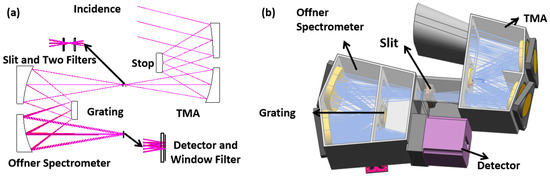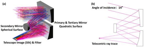 A TMA system was selected for its non-chromatic aberration and good performance in imaging aberrations. In the design process, considering the co-alignment of various component positions, there is no eccentricity or tilt set for the three mirrors relative to the stop position (secondary mirror). This ensures that the centers of curvature of the three mirrors are coaxial, and the axial distances from the stop to the other two mirrors are equal. Considering that using the TMA system, after constraining the relative positions of the components, may result in a degradation of imaging capability, different quadratic concave mirrors with different k (conic constant of the surface) values were used to counteract the decrease in imaging quality. The ray trace is shown in Figure 3; there is a filter placed in front of the imaging plane, which is used to select the working waveband and block the ash. In addition to laboratory testing, there is a need to observe soil during flight tests, and the aircraft will inhale a large amount of dust during takeoff and landing. To prevent dust from blocking the slit, the filters placed on both sides of the slit not only select the working wavelength range but also serve to protect the slit.