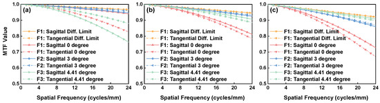 The MTF curves of the optical structure: 360 nm (a); 600 nm (b); and 850 nm (c).