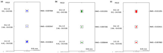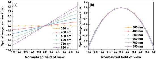 Due to the short distance, the scalar form is used instead of the and vector (x, y) form to approximately calculate the initial parameters of the structure. When confirming the initial structure of the Offner configuration, the primary focus is on calculating the curvature radius of each component. The input conditions for this calculation include the instrument’s required dispersion length , the chosen diffraction order (m) for the grating (which is +1st order in this case), and the spectral range of 360–850 nm. Utilizing these parameters, the curvature radius of the grating can be determined. Next, Equations (7)–(9) are used to solve for the positions of the sagittal and meridional image points at the central wavelength . Finally, Formula (10) is employed, where at the central wavelength and at the center of the field of view, the distance between two image points is zero when there is no astigmatism. This process ultimately confirms the curvature radii required for the two mirrors. The resulting initial structure yields the following curvature radii: the curvature radius of the first mirror is 118.4 mm, the curvature radius of the grating is 74.8299 mm, and the curvature radius of the third mirror is 120.1 mm. These values are crucial for establishing the optimal configuration of the Offner spectrometer, ensuring its effective performance within the specified spectral range.