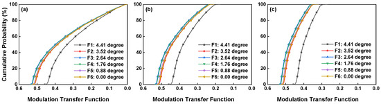 TOL MTF with grating surface RMS of 1/10 λ (a), 1/15 λ (b), and 1/20 λ (c).