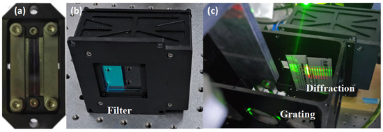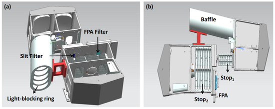 To analyze the stray light levels inside the instrument, a baffle, a light-blocking ring, and two other stops were installed. The internal mechanical structure is shown in Figure 10. Among these components, the baffle, light-blocking ring, stop 1, and stop 2 mainly block stray light within the FOV. The slit filter selects the working wavelength range, and the FPA filter primarily suppresses the +2nd- and 0th-order diffracted light from the grating.