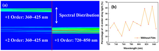 where Signal1 represents the irradiance of the +1st-order diffraction light of the pixel, and Signal2 represents the +2nd order. The structure of the optical machine was modeled and the ratio of the imaged and non-imaged light was analyzed at the 720–850 nm band position. In this case, the stray light ratio under each spectral channel was analyzed separately using 10 nm as the sampling interval and then fitted by discrete points. Since the +2nd order is the most dominant stray light, only this part of the stray light was briefly analyzed. As shown in Figure 11, the +2nd-order stray light overlaps with the +1st-order light in the spectral direction on the image plane. Due to the light source being set like that of Earth’s reflectance curve, and combined with the system’s transmission efficiency, the proportion of stray light signals is higher in the longwave region than in the shortwave region, reaching 60% at the peak.