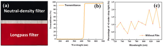 Based on the above analysis, it is necessary to suppress the +2nd-order diffraction light from the shortwave positions in the longwave positions. A region-specific filter film was applied to the detector window as coating, which was divided into three areas: an absorption region, a transmission region, and a long-wavelength transmission region. The resulting suppression effect is shown in Figure 12, with the longwave position reaching below 0.2%. In this context, the long-wavelength transmission region of the detector window achieves a cutoff depth of OD4, equivalent to 10−4, thereby effectively suppressing the +2nd-order diffraction light.