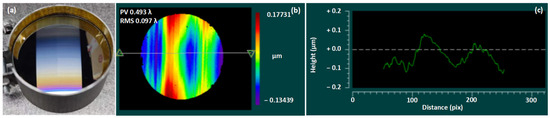 Due to the low diffraction efficiency of holographic gratings, the manufacturing method of mechanical engraving was selected. The depth of the grating grooves is 0.32 μm with a blazed angle of 2.4 degrees after manufacturing. The wavefront quality of the grating surface measured with an interferometer is shown in Figure 13. The result shows that the RMS is 0.097 λ, constrained by the high efficiency of the grating.