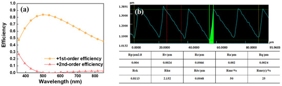 Since other orders are far from the +1st order in the imaging plane, only the diffraction efficiencies of the +1st and +2nd orders are listed in Figure 14 after measurement. The diffraction efficiency of this convex grating remains above 50% across the working wavelength range, reaching a peak of 83% at 530 nm. It shows a high energy of the +2nd-order diffraction near 400 nm. The profiles of the grooves observed under a laser microscope and the obtained surface roughness are also shown in Figure 13.