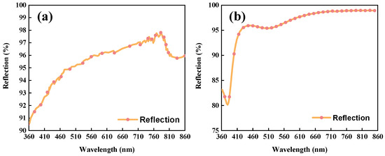 Due to the requirement for high reflection within the wavelength range, the mirror surfaces were coated with silver. The efficiencies of the mirrors in the TMA and Offner system are shown in Figure 15. All mirrors’ reflection is above 90% on average, but the Offner mirrors have a lower reflection within the 360–400 nm range. According to the efficiency transmission law of the system, the energy in the final imaging plane is lower in the 360–400 nm range, which decreases the SNR.