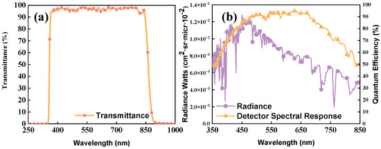 Figure 16a shows the transmittance of the slit filter, whose transmission exceeds 94% in the range of 360–850 nm, with an outside waveband efficiency of less than 0.4% and a cut-off depth of OD3. There is a 5–8% decrease in efficiency at the edges of the waveband, resulting in a small impact on the energy of the spectral channels at 360–370 nm and 840–850 nm. For SOM detection, the surface albedo is 30% and the solar zenith angle is 30 during the window period; MODTRAN was used to describe the ground radiance of the working waveband, and the detector’s quantum efficiency is listed in Figure 16b. This study chose the back-illuminated CMOS GENSE400BSI; the efficiency is always above 50% in the 360–850 nm range and a peak of 92% is obtained at 580 nm.