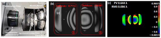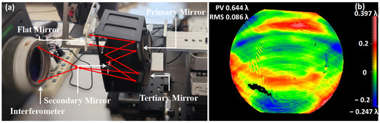 The telescope uses a self-aligning adjustment method. Due to the silver coating on the three mirrors, the only requirement for the flat mirror is 1/40λ in roughness, and coating is not necessary, to ensure a high level of fringe contrast. Initially, the secondary mirror was fixed, and the primary and tertiary mirrors were displaced using a displacement table to align the focus of the telescope with the interferometer’s focus. At this step, the RMS of the wave aberration of coarse adjustment was less than 0.2λ. Then, fine adjustment of the mirrors’ angle was performed to achieve a wave aberration of 0.1λ, thereby approaching the wave aberration of the design. The optical path of installing and adjusting and the results of fine adjustment are shown in Figure 21.