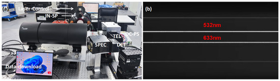 After the above steps, the spectrometer and telescope components both exhibit great imaging quality. The final assembly process was aligning the spectrometer with the telescope at the slit position by finding an appropriate relative angle and position between the two components. The detector was moved to compensate for the defocus, and the spectral lines were tilted and bent. The process used a Laser Control System (Laser-Control), an integrating sphere (IN-SP), and a collimator to provide an incident condition with a single spectrum. The optical equipment and alignment scene are shown in Figure 22. At last, several spectral lines fall within their own one row of pixels with clear edges.