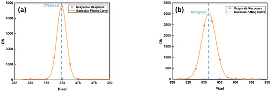 The imaging position of line pairs with an actual spacing of 5.674 mm was analyzed. To accurately calculate the position of each line, the gray analysis and Gaussian fitting of the imaging position were conducted to obtain the position information of 0.1 pixels; the results are shown in Figure 24.