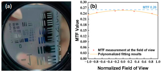 The 1951 USAF resolution test plane (a); MTF testing and fitting curve (b).