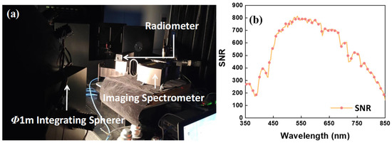 In this step, ground-reflected irradiance was simulated using a light source and an integrating sphere. However, due to the lower brightness of the light source in the 360–400 nm band compared to other bands, the simulation of ground-reflected irradiance at the same input power faced challenges. To overcome this, the input power and integration time were increased to simulate ground-reflected irradiance at shortwave positions. During this test, the SNR was first measured in the 400–850 nm band. Then, the power of the light source was increased to enhance the signal in the shortwave band for SNR measurements at those positions. Notably, only the light source power was adjusted during the test, while the integration time was kept at 13 ms. This setup was consistent with a ground resolution of 100 m and an equivalent ground line flight speed of 7.8 km/s, resulting in a maximum effective exposure time of 13 ms for each ground spatial point, thus ensuring spatial data continuity. The results show that at shortwave positions (360–400 nm), the SNR reached 200, and the value reached 800 at 550 nm. Detailed information about the testing equipment and the results are provided in Figure 28.