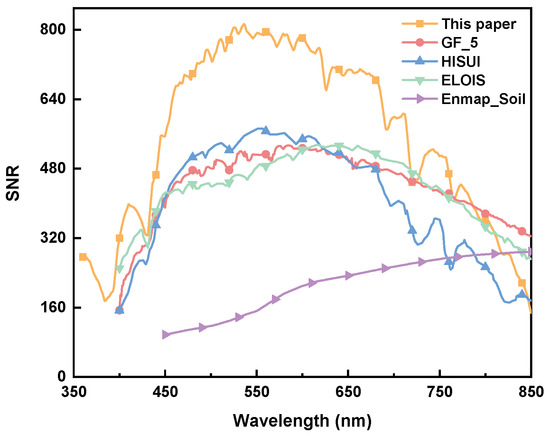 As can be seen from Equation (2), the stronger the spectral resolution of the spectrometer (the narrower the wavelength range corresponding to a single pixel), the lower this portion of energy will be. The ground resolution s is related to the ground scan speed v at orbital altitude, corresponding to the maximum integration time t of the instrument in normal operation, such that s = vt. The SNR comparison in this article refers to the typical operating conditions (corresponding to its own ground and spectral resolution) of each instrument when observing soil. Table 6 shows the resolution indicators of some devices.