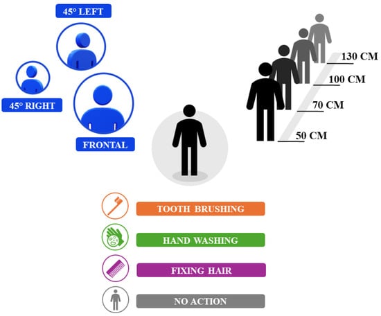 Scheme of the experimental setup with different orientations, distances, and performed actions.