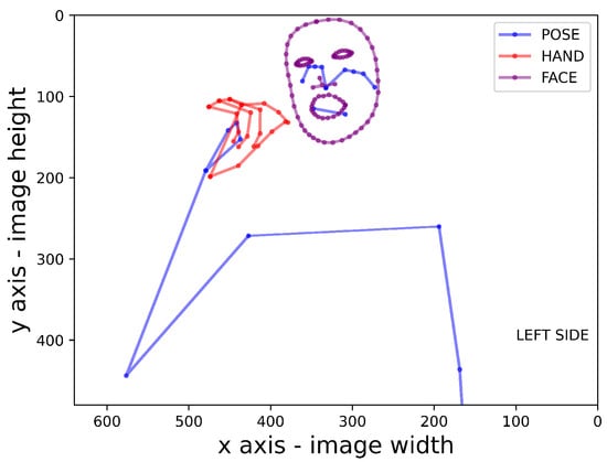 The first step of the proposed approach involves the use of the MediaPipe framework. MediaPipe allows the coordinates of keypoints to be extracted from the pose, hands, and/or the face of the subject performing the action. Figure 3 shows an example scheme of the possible keypoints extracted from a subject. The pose model permits the extraction of 33 three-dimensional points, with a fourth dimension provided by the visibility. The third dimension is discarded in the pose model, as the model specifications suggest that it is prone to error [27]. We only use the first 23 keypoints, which relate to the upper body. The hand model provides 21 three-dimensional coordinates, while the face model can provide up to 478 three-dimensional points describing a face mesh. For the face keypoints, we consider only the face silhouette, the eye contour, and the lip contour in order to simplify the training stage and reduce the dimension of the input features. By default, the vertical coordinates are normalised to the image height in pixels and the horizontal coordinates are normalised to the image width in pixels. The origin point is set to the upper left corner of the frame. The coordinates of the third dimension for the hands are provided in relation to the wrist position, while the coordinates of the third dimension for the face keypoints describe their depth with respect to the center of the head.