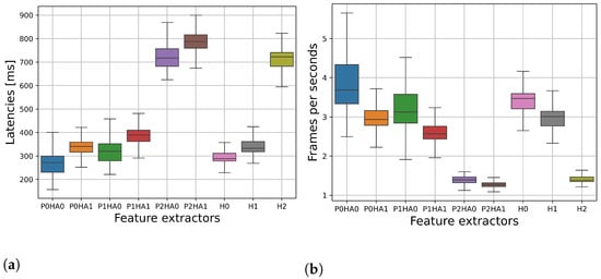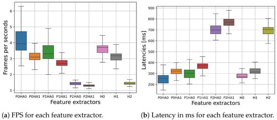 We observe that the median fps results for P0HA0, P0HA1, P1HA0, H0, and H1 are all between 3 and 4, corresponding to a latency per frame of around 300 ms; P1HA1 has median fps between 2 and 3, with latencies per frame between 300 and 400 ms. The most complex models using the highest complexity for the pose models, namely, P2HA0, P2HA1, and H2, work best between 1 and 2 fps, which corresponds to a latency per frame between 700 and 800 ms. In general, increasing the complexity of the architectures used for the pose and hands models increases the inference time for prediction of the keypoints. The highest jump in latency is seen for the feature extractor using the most complex pose models. As previously mentioned, the Holistic 2 (H2) model is slightly more efficient compared to its P2HA1 counterpart.