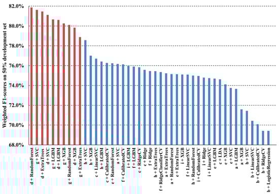 In Figure 5, we order the weighted F1-scores computed on a random 50% sample of the development set for the top five best performing models for each feature set listed in Table 3. The top ten F1-scores are composed of the top five performing models for feature sets (d) and (g). These two feature sets were extracted with the P2HA1 feature extractor, and both consist of two-dimensional pose and three-dimensional hand models with respect to the nose keypoints as the origin of the XY plane. The only difference is that normalisation based on shoulder distance is applied to the X and Y coordinates in feature set (g). It can also be noticed that the five best resulting ML models are the same, i.e., Random Forest, Support Vector Machine (SVC), Extra Trees Classifier, Light Gradient Boosting Machine (LGBM) Classifier, and Extreme Gradient Boosting (XGB) Classifier.