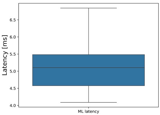 The LGBM model has a median latency per frame of 5.10 ms (interquartile range 4.58–5.48 ms), as can be seen in Figure 6. The effect of adding the LGBM model and preprocessing steps on the overall latency and fps of each feature extractor can be seen in Figure 7. The latency and fps were computed as previously described.