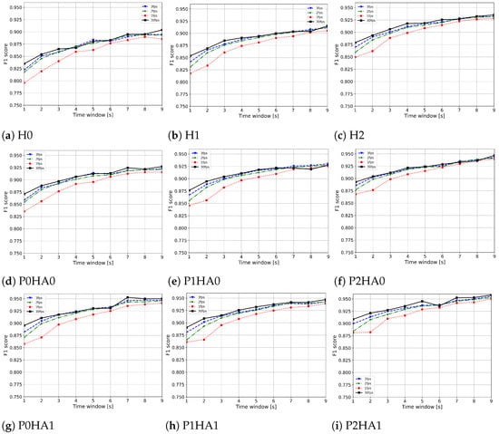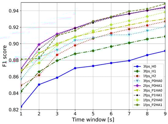 We used these fps values to downsample the videos in the experimental dataset. We report the weighted F1-scores when increasing the observation window from 1 s to 9 s with a step of 1 s. It can be observed that the P2HA1 feature extractor, although it is the most complex and has the lowest median fps, obtains the best weighted F1-score with an observation window of at least 6 s. From 7 s, the model achieves weighted F1-scores of at least 94%. For observation windows of less than 6 s, the P0HA1 feature extractor working at 2 fps achieves the best overall score, followed by P1HA1 working at 2 fps. It can be observed that the top three performing feature extractors all use HA1 for the hand keypoints, which is the most complex architecture for this extraction. Figure 9 shows the trends in weighted F1-score for all possible MediaPipe feature extractors for increasing observation windows of 1 s to 9 s with a step of 1 s, labelled to indicate 30 fps, 3 fps, 2 fps, or 1 fps. As expected, lower fps values correspond to lower scores; however, the difference becomes less evident as the observation time increases.