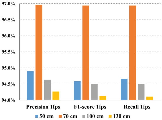 The experimental dataset contains subjects at four possible distances, i.e., 50 cm, 70 cm, 100 cm, and 130 cm. Therefore, we stratified the metrics for all the models between these distances to understand whether they have a significant impact on model performance. Figure 11 shows the weighted metrics computed for each distance, using the best P2HA1 feature extractor and downsampling the videos at 1 fps, the normal working conditions for the chosen extractor.
