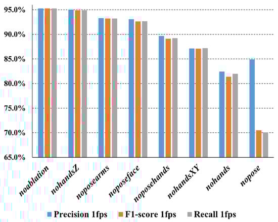 Figure 12 illustrates the relevance of certain features for classification when comparing the ablation study with the case of no ablation. Table 10 demonstrates how each feature is relevant for a specific class. The Z-coordinate of the hands appears to have a relatively minor impact on the performance (between 0.3% and 0.4%), followed by the absence of the pose arms and pose face (around 2%). The first large negative jump is seen with the absence of the pose hands, which negatively affects the recall for all actions with the exception of “washing face“. A clear decline in performance is also evident in the absence of the X–Y hand coordinates, with a reduction of approximately 8% observed across all metrics.