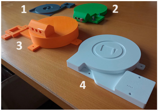 The main part is a compact block with a capillary, the design of which was based on earlier research described in Adámek et al. [7]. As part of the development, several various types of these blocks had been designed and printed (Figure 1) during the study. The grey block (1) represents the original prototype from the previous study by Adámek et al. [7], while the green (2) and orange (3) blocks are prototypes of the improved type. The white block (4) is utilized within this paper.