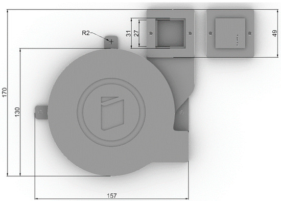 The two-tier capillary’s length was 4.689 m, which is comparable to the previously described three-tier capillary with a length of 4.692 m. Its design featured two mirrored helices interconnected by a continuous curve, ensuring that there were no excessive fractures that could hinder the printing process. The capillary was successfully printed using a commercially available Bambu Lab PS1 printer (Bambu Lab, Shenzhen, China) equipped with a standard 0.4 mm nozzle. Figure 3 illustrates the external dimensions of the compact block and the square measuring chamber.