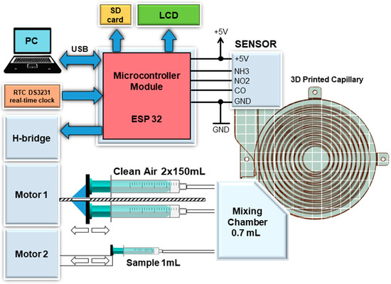 The MiCS-6814 is a compact MOS sensor containing three fully independent sensing elements (RED, OX and NH3) on one package [18]. The microcontroller is also connected to the RTC DS 3231 real-time clock and SD memory card. This solution allowed the device to work without a connected computer and computer communication infrastructure and allowed for easier data transfer and backup. In addition to higher processing power, greater communication capabilities, and the ability to store more data, one of the main advantages of this microcontroller was the higher resolution of the A/D converter (12 b instead of the original 10 b). This allowed for a further increase in accuracy of the sensed signal.