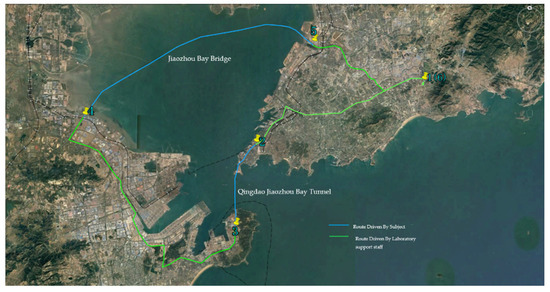 In comparison to virtual driving experiments, there are many unstable factors in the process of vehicle driving experiments, such as lane changing and overtaking. To induce a state of road hypnosis in drivers as effectively as possible, the Jiaozhou Bay Tunnel and Jiaozhou Bay Bridge in Qingdao were chosen as the settings for the vehicle driving experiments in this study. The Jiaozhou Bay Tunnel has a total length of 7.797 km, with the sea-crossing section measuring 4.095 km. The road is designed as a six-lane urban arterial road with bidirectional traffic, featuring separated lanes for each direction. The main tunnel cross-section is elliptical. Through vehicle driving experiments, it was found that this tunnel is a closed, straight-line section of road. The tunnel’s road lights are placed at fixed intervals along both sides of the road, which are highly conducive to inducing a state of road hypnosis in drivers. The Jiaozhou Bay Bridge has a total road length of 42.23 km and a speed limit of 80 km/h. This bridge features six lanes with bidirectional traffic and has a bridge length of 31.63 km. Through vehicle driving experiments, it was found that although the Jiaozhou Bay Bridge is not an enclosed section, the driving environment is relatively monotonous. The seascape acts as visual “white noise”, easily inducing a state of highway hypnosis in drivers.
