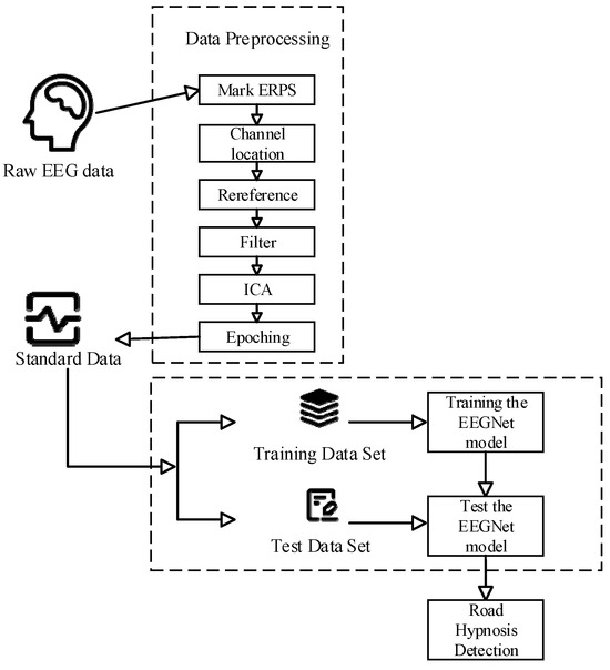 In this study, the issue of road hypnosis state identification among drivers is addressed by deeply analyzing the drivers’ electroencephalogram (EEG) data. A recognition model based on the ICA-EEGNet network is trained for identifying road hypnosis. The main tasks of this study include: