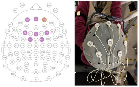 The electrode montage was established with a custom XML configuration through mapping each electrode to specific locations on the scalp corresponding to the international 10–20 system. The device consisted of eight primary electroencephalogram (EEG) channels located primarily in the frontal lobe region: Fp2, Fpz, Fp1, F4, Fz, F3, FC2, and FC1.