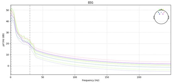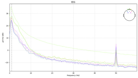 The power spectral density of the EEG after applying low-pass filtering, high-pass filtering, and a notch filter at 40 Hz is shown in Figure 5.