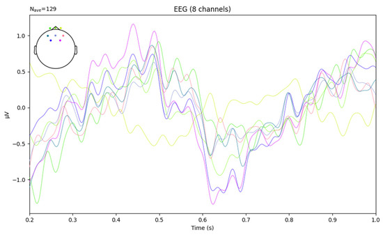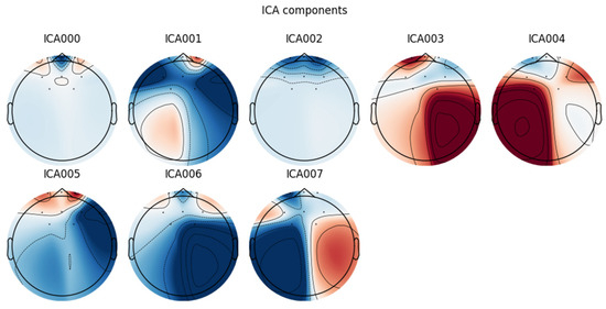 After performing independent component analysis (ICA) fitting, the spatial distributions of each ICA component were visualized as shown in Figure 6. The topographic maps of the eight independent components obtained from the ICA analysis are presented. The projection patterns of each independent component on the scalp are reflected in these topographic maps, providing intuitive evidence for judging whether they represent brain electrical activity or artifacts. For example, the spatial distribution of typical eye movement or electrocardiographic interference is displayed by the components ICA000 and ICA001; hence, they were selected as exclusionary factors.