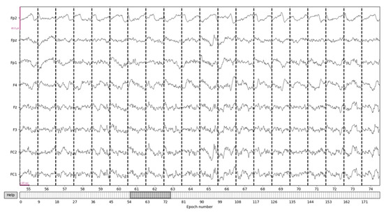 (1) In this study, the selected EEG channels are located in the frontal lobe area, as shown in Figure 4, including the Fp2, Fpz, Fp1, F4, Fz, F3, FC2, and FC1 channels. The frontal lobe area is central to cognitive functions, attention, and emotional regulation in humans. It is closely associated with executive functions, levels of attention, emotional states, and arousal levels. Road hypnosis involves a decline in a driver’s attention and an increase in reaction time, making the frontal lobe area particularly relevant for studying this phenomenon.