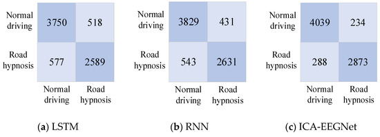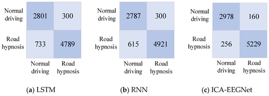 The confusion matrices for the models obtained after training with LSTM, RNN, and ICA-EEGNet networks are shown in Figure 11 and Figure 12.