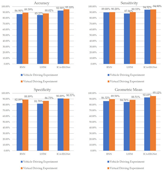 As shown in Figure 13, the accuracy, sensitivity, specificity, and geometric mean of EEGNet were all exhibited superiorly to those of RNN and LSTM. This indicates that the road hypnosis state of drivers can be accurately identified from EEG data by the EEGNet neural network. RNN was superior to LSTM in terms of accuracy and specificity. However, there was still a significant gap compared to EEGNet. The overall performance of the RNN model was not stable enough. The lowest identification accuracy and specificity were exhibited by LSTM. The LSTM model was the worst-performing model among the three types.